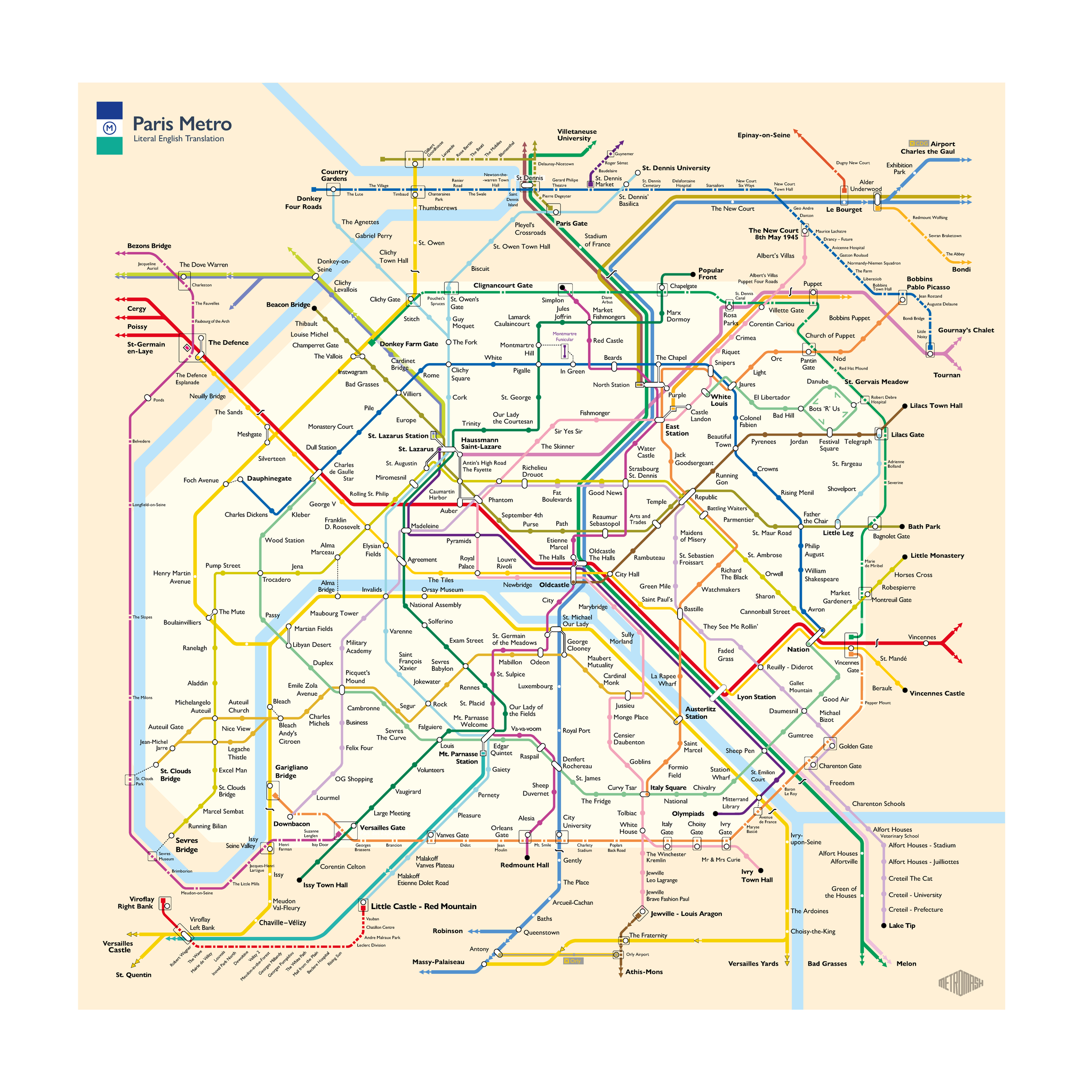 Paris Metro Map: Literal English Translation 50x50cm Art Poster
